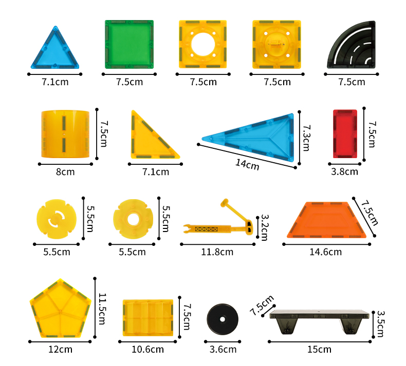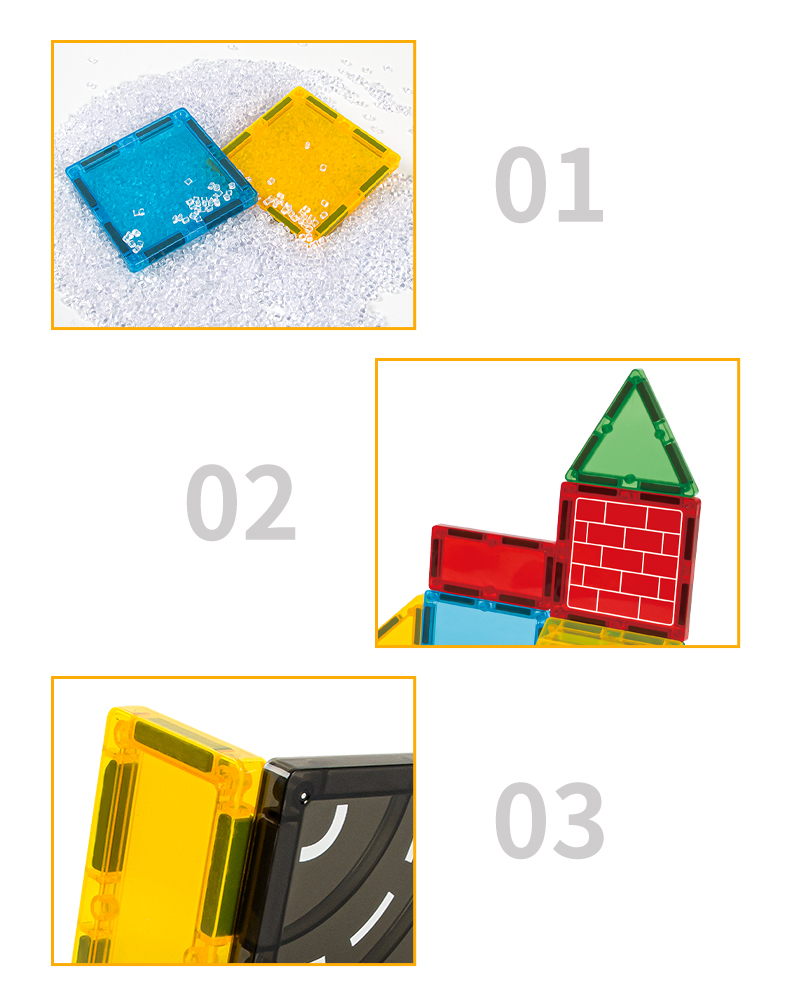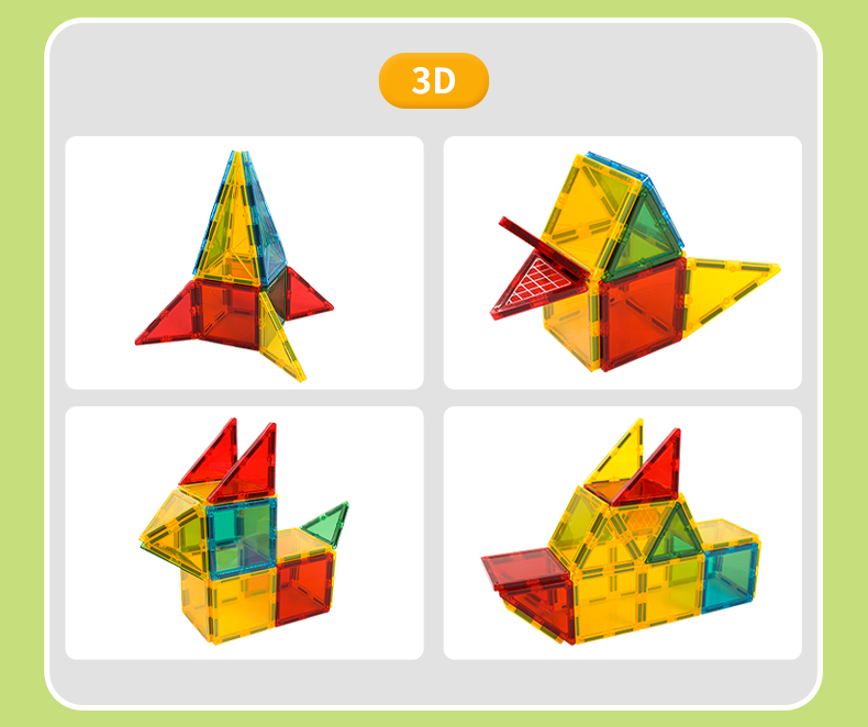 Τα κομμάτια συνδέονται εύκολα χάρη στους ισχυρούς μαγνήτες, επιτρέποντας την κατασκευή ποικίλων σχημάτων, σπιτιών, πύργων, κάστρων ή ακόμα και μοναδικών έργων τέχνης. Τα μαγνητικά τουβλάκια συνδυάζουν διασκέδαση, δημιουργία και αισθητική, αναπτύσσοντας λεπτή κινητικότητα, φαντασία και αίσθηση αρμονίας και ομορφιάς.